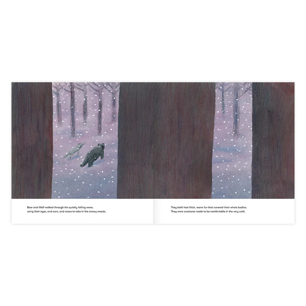 Bear and Wolf become unlikely companions one winter's evening when they discover each other out walking in the falling snow; they are young and curious, slipping easily into friendship as they amble along together, seeing new details in the snowy forest.