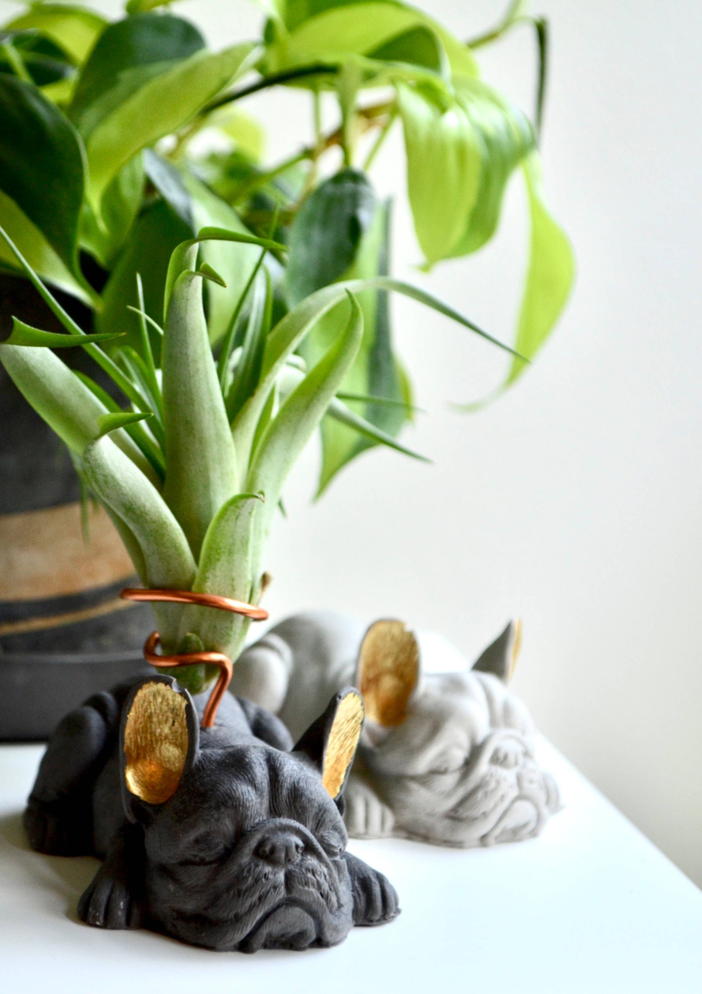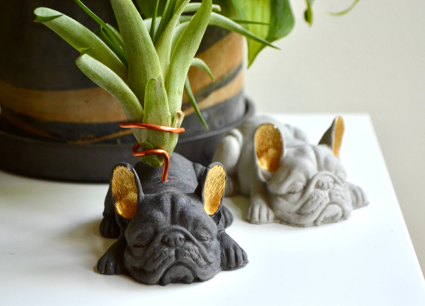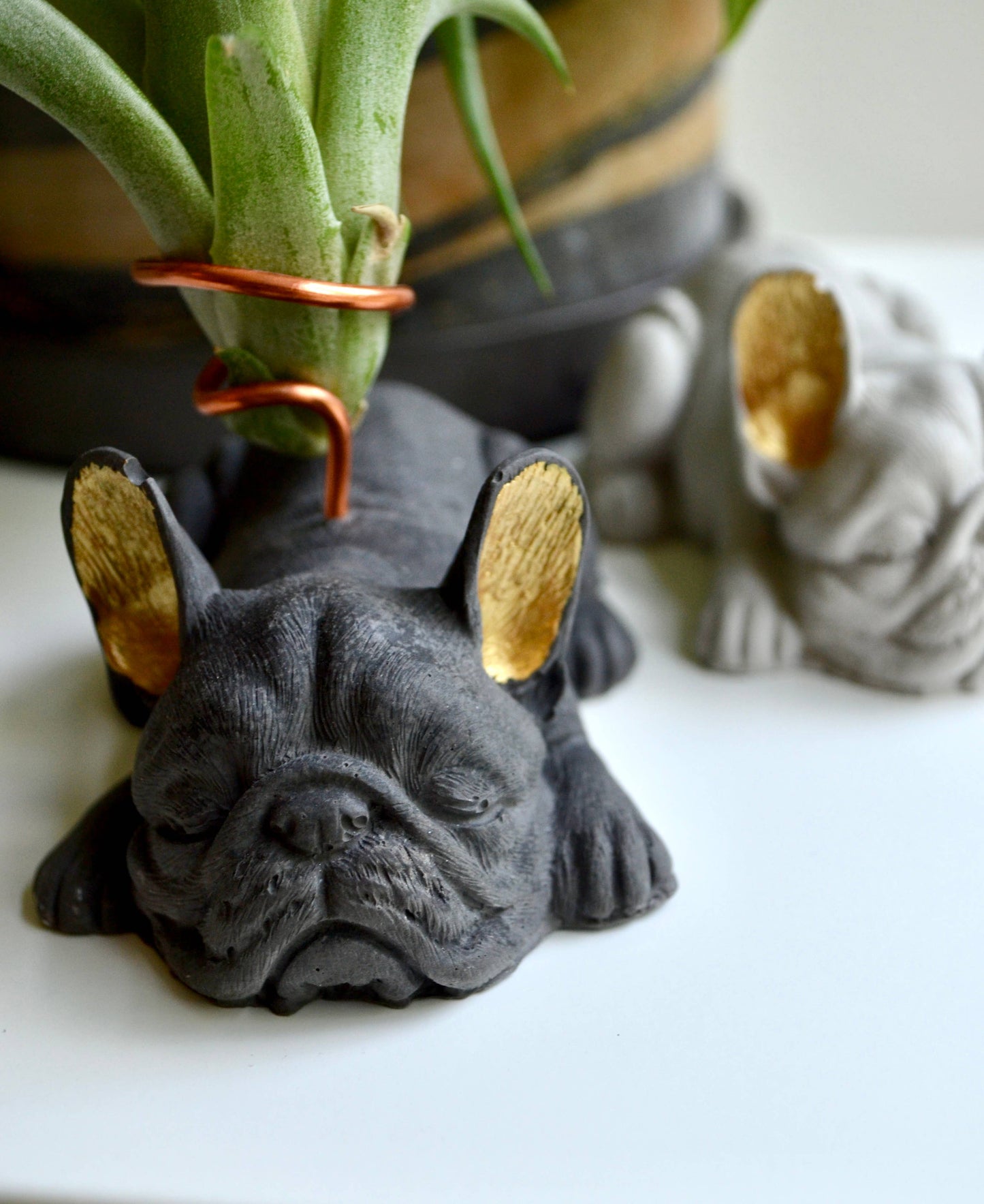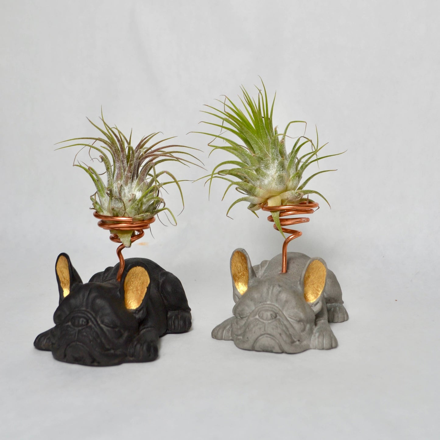 Love your pup and plants too? You're going to love this French Bulldog Airplant Holder. Made from concrete, these bulldogs are hand-crafted with meticulous attention to detail and color. They'll fit seamlessly into any space or garden. This French Bulldog Airplant Holder makes for a unique housewarming present! Wire used is a tarnish free aluminum wire in copper color.
