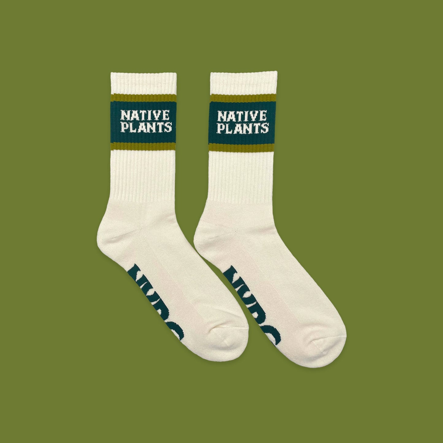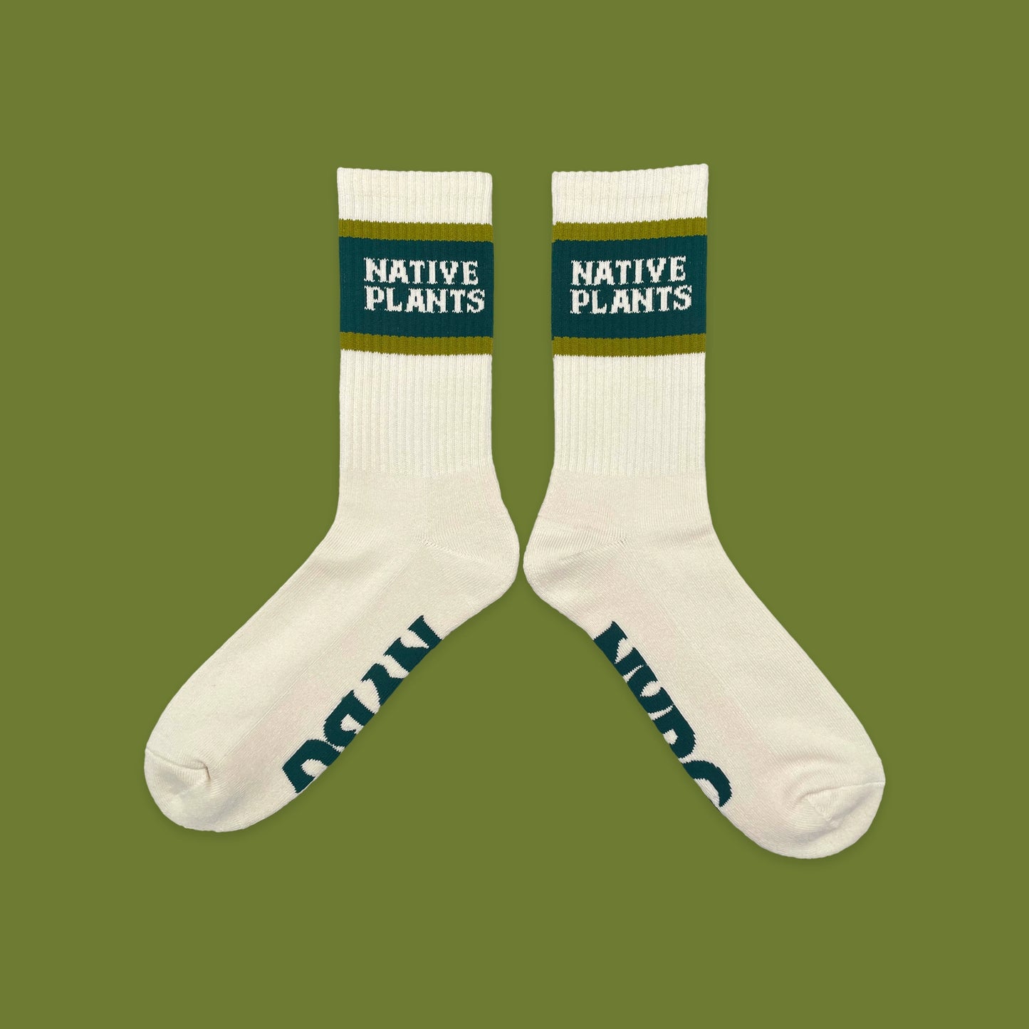 Our Native Plant vintage inspired crew socks are super soft and comfy with a half terry foot. The fabric blend is 76% Cotton 22% Polyester 2% Elastane. One size fits most.