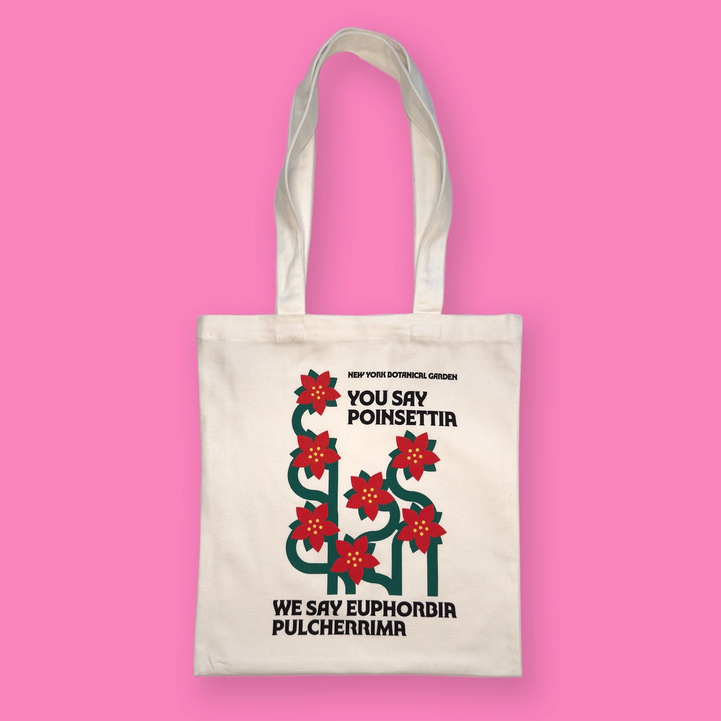 You Say Poinsettia, We Say Euphorbia Pulcherrima. This stylish image is printed on a cream heavyweight (9.4 oz.) tote that measures 14"x15.3"