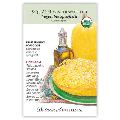 Also called gold string melon, spaghetti squash is unique among winter squashes; when cooked, the flesh falls away from the shell in strands like spaghetti, and retains a tender, yet al dente, texture. Savory flavor that is delicious, and low calorie, with a simple bit of butter and salt. Each plant can yield 5 to 7 squash.