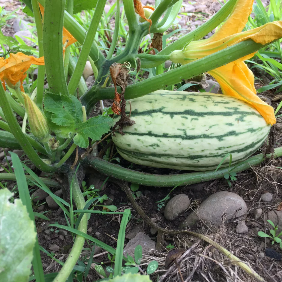This small oblong squash was introduced in 1894 by the Peter Henderson Company of New York. Although a very popular home garden variety, the delicata's delicate nature and sweet flavor were almost lost because it was considered commercially unfeasible to grow. Its thin skin made it difficult to ship and its lower yields did not make the grade for mono-crop agriculture. It has since been improved--and has won over lovers of sweet winter squash everywhere. Note: this is the vining form of Delicata Squash--not the bush-habit variety. It forms small- to medium-length vines. See Cornell's Bush Delicata Squash for the true bush-habit type.