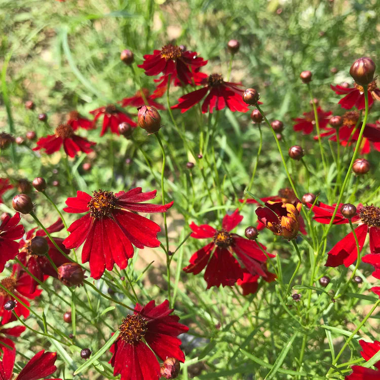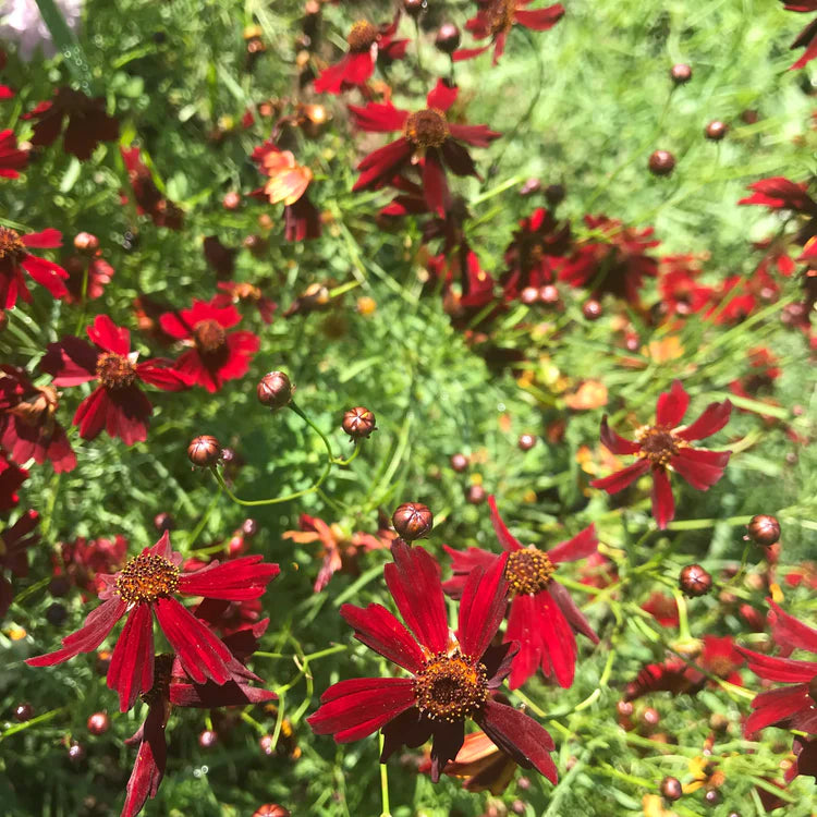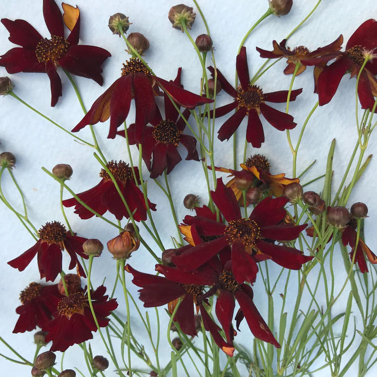 Flowers are embodied sunshine, and sometimes that sunshine can be harvested in the form of a golden-orange dye. Native to plains and meadows of North America, Dyer’s Coreopsis has long been used by textile artists for its richly pigmented petals. Easy to grow and produces a plethora of cadmium red blossoms, sometimes ringed with yellow. Our strain has a higher proportion of solid red blooms than most. Also wonderful as an ornamental alone.