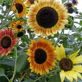Helianthus annuus. 53 days. Shades of autumn colors ranging from red, mahogany-red, burgundy, russet-bronze, vivid gold, all in bicolor blends. 3-5 in. flowers. Plants grow 6-8 ft. tall with a number of secondary blooms. Small (2 g) packet has about 50 seeds.