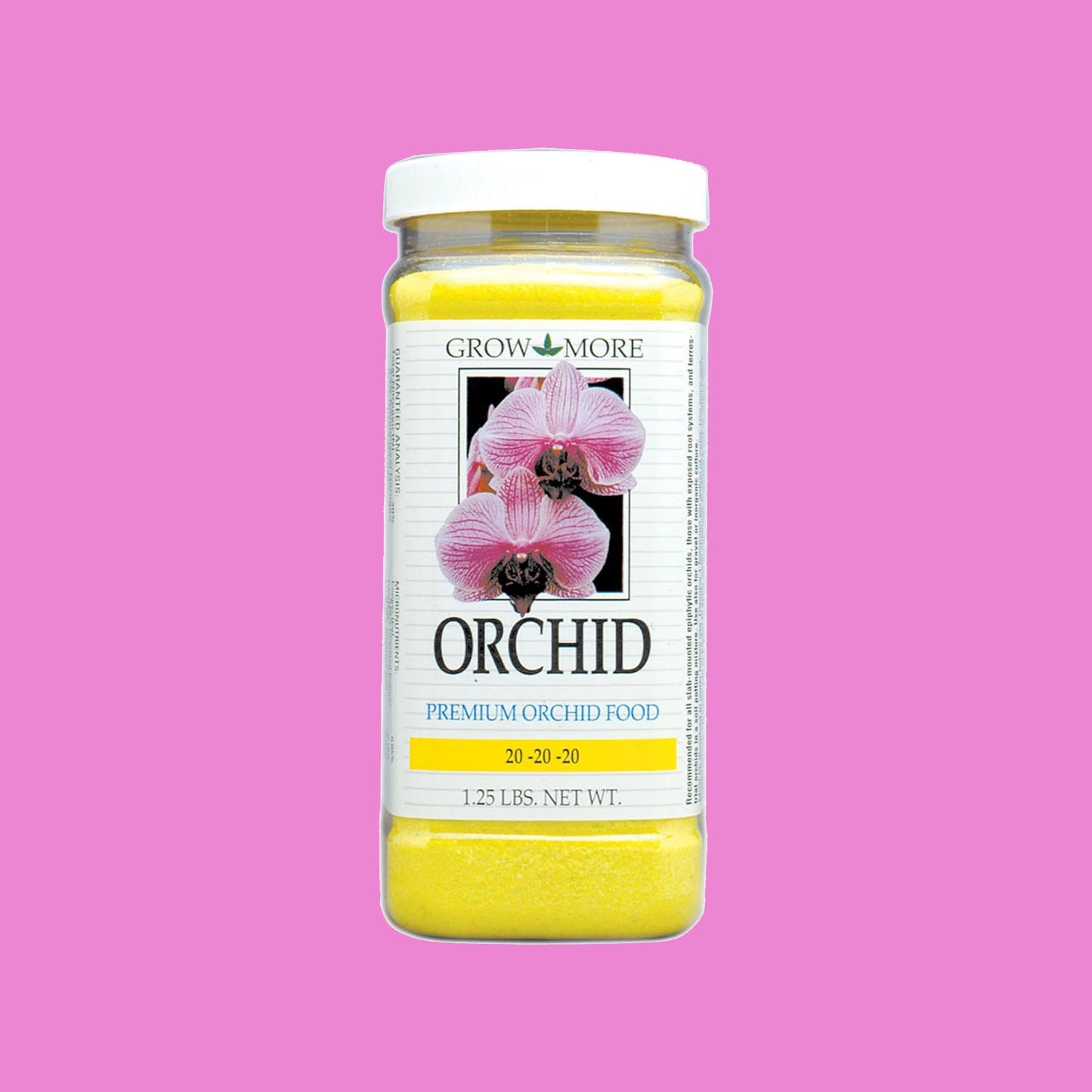 Grow More's Premium Orchid Fertilizer for soil maintenance year round, plant food for healthy growth and vibrant blooms. Encourage strong, vigorous growth and high bloom in your orchids when you use this premium quality formula (20-20-20). This water soluble plant food is recommended for all slab-mounted epiphytic orchids, terrestrial orchids in a soil potting mixture, and orchids growing in gravel or other inorganic culture.