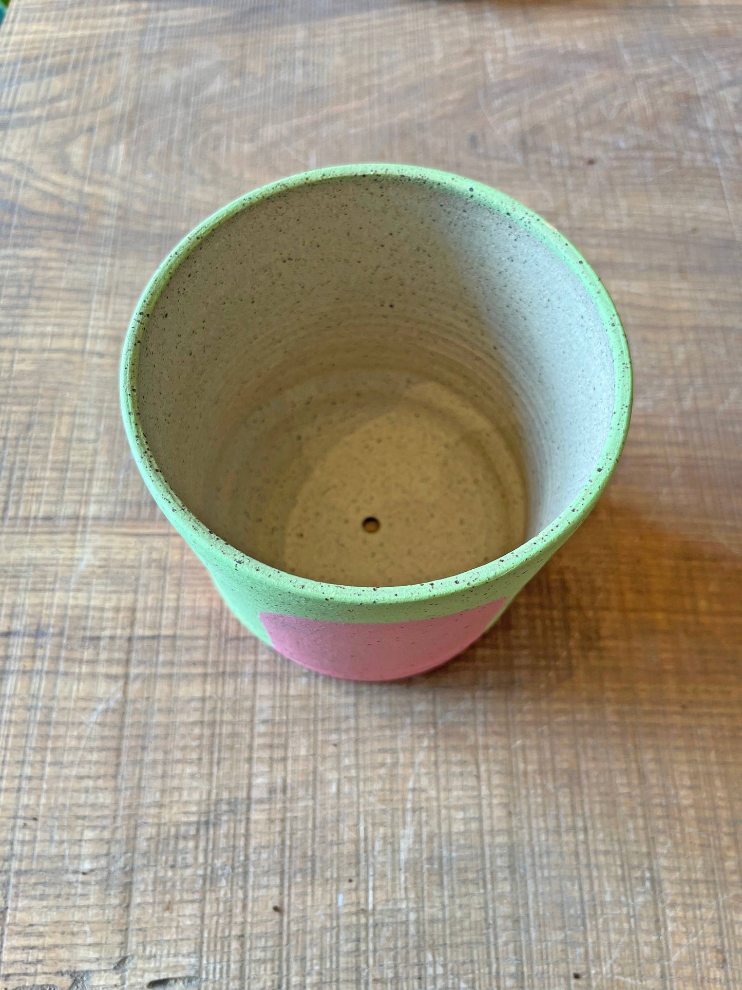 Our portal planters are a colorful yet earthy addition to any home! Hand thrown on the potters' wheel, this planter is made of high fire brown stoneware. It is finished with a variety of colorful underglazes in a matte finish that allow the speckles of the clay to shine through. This planter measures 5" tall and 5" in diameter at the top.