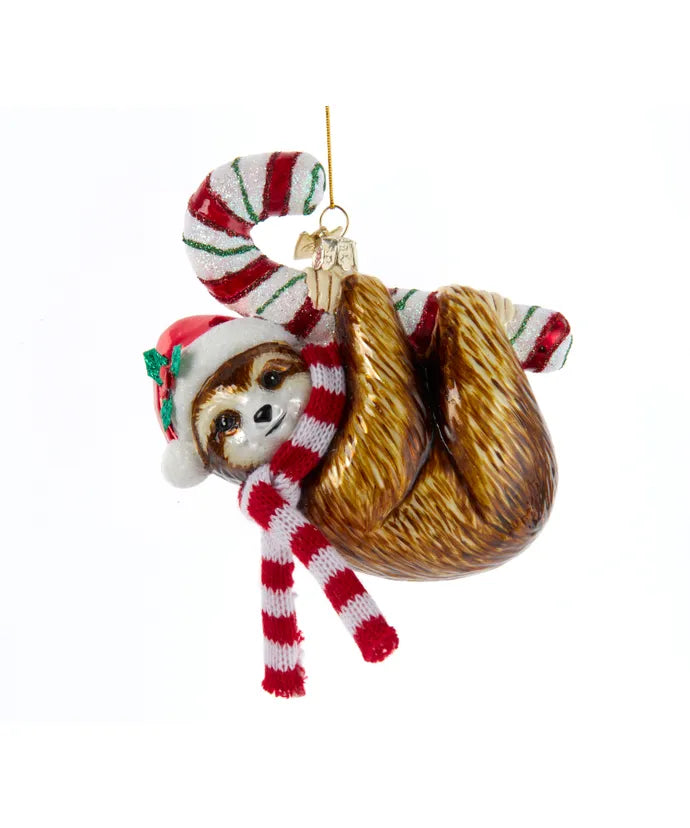 This adorable 4.75 inch glass sloth holding candy cane ornament is a sweet addition to any holiday décor or Christmas tree. The sloth is wearing a Santa hat and a red and white scarf and his hanging from a red and white glittered candy cane.
